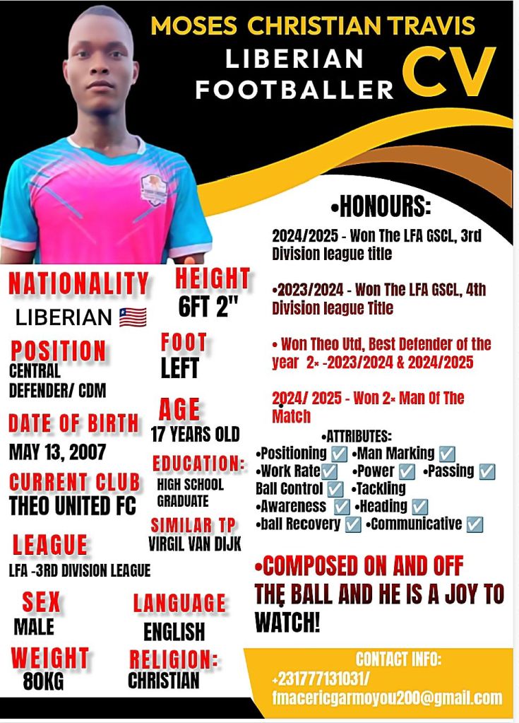 MOSES CHRISTIAN TRAVIS CV May 04 2025 Share this: Share on X (Opens in new window) X Share on Facebook (Opens in new window) Facebook Like Loading... Published by 13managements2007 Hi, welcome to this site, I am a Liberian Journalist/ Talent Recruiter / Footballer Intermediary View all posts by 13managements2007