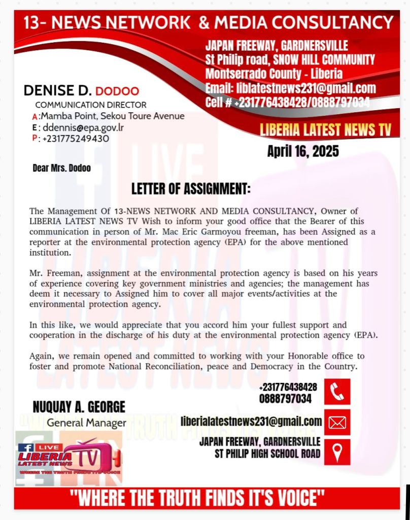 Mac Eric Letter of Assignment at EPA May 24 2025 Share this: Share on X (Opens in new window) X Share on Facebook (Opens in new window) Facebook Like Loading... Published by 13managements2007 Hi, welcome to this site, I am a Liberian Journalist/ Talent Recruiter / Footballer Intermediary View all posts by 13managements2007